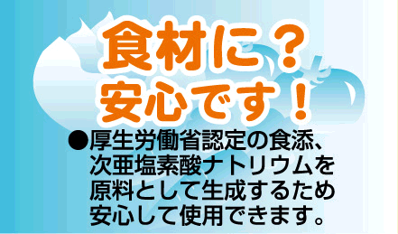 厚生労働省認可の食添殺菌剤である次亜塩素酸ソーダと希塩酸を水で希釈し混合した生成水ですから安全なのです。