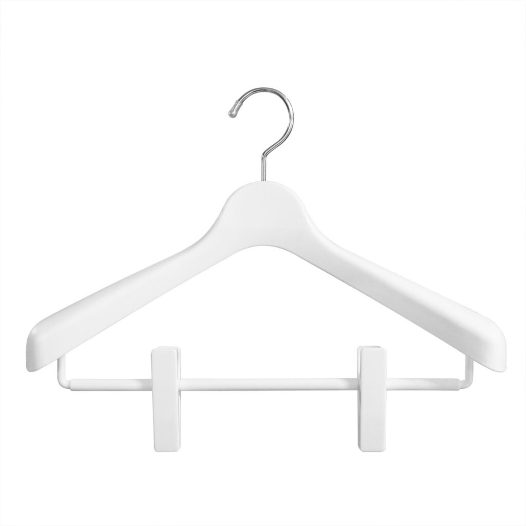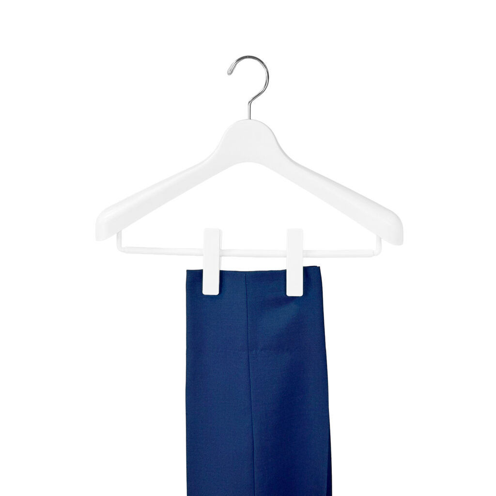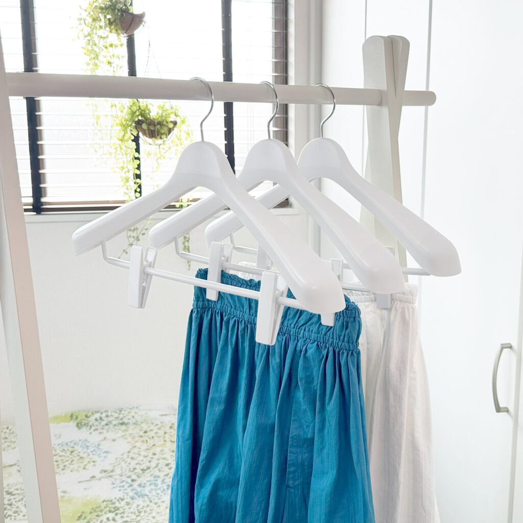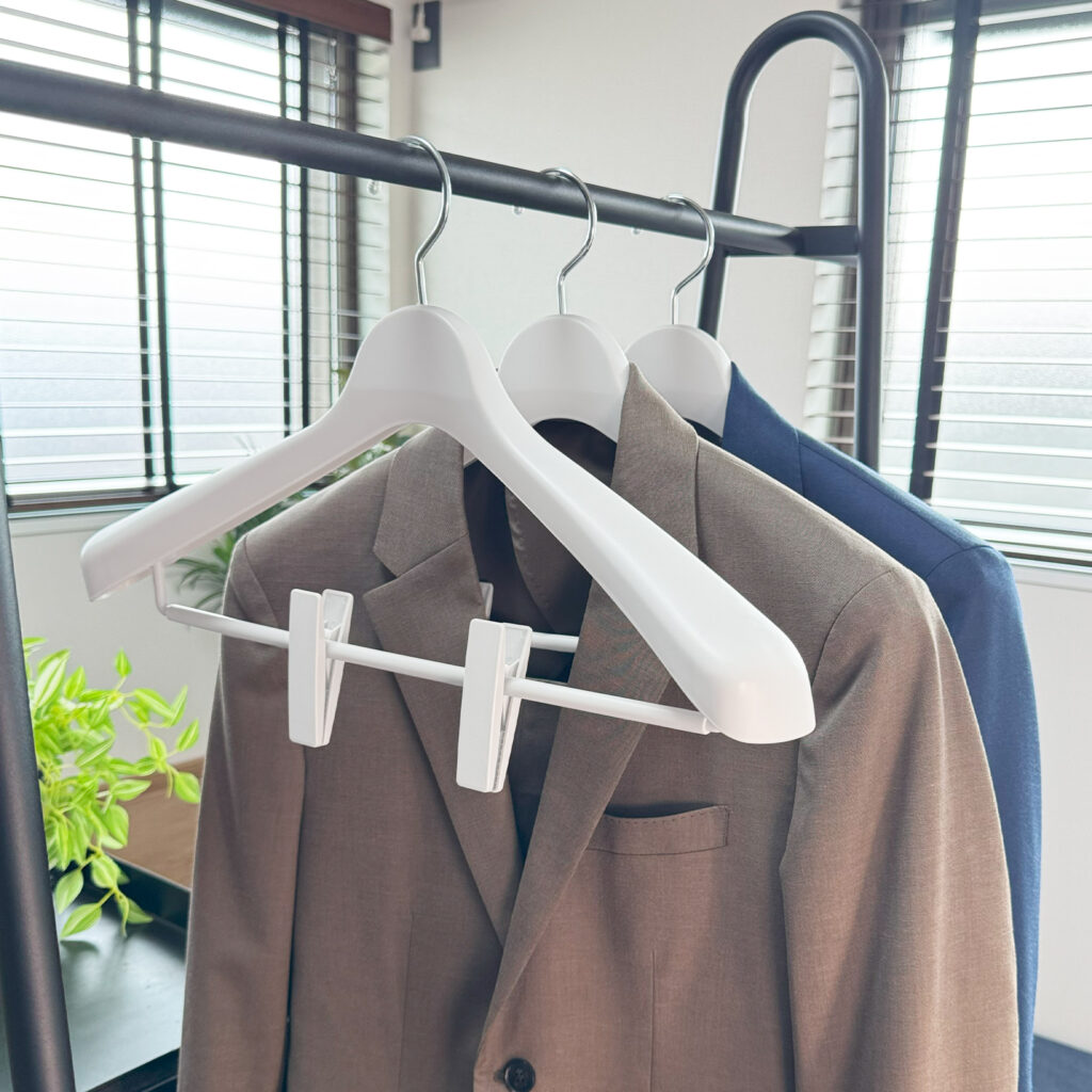 ホワイトカラーで衣類が引き立つ、ジャケット用ハンガー。