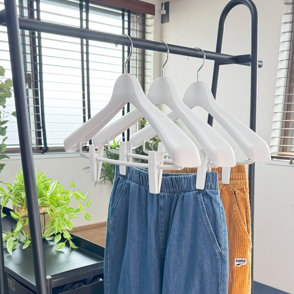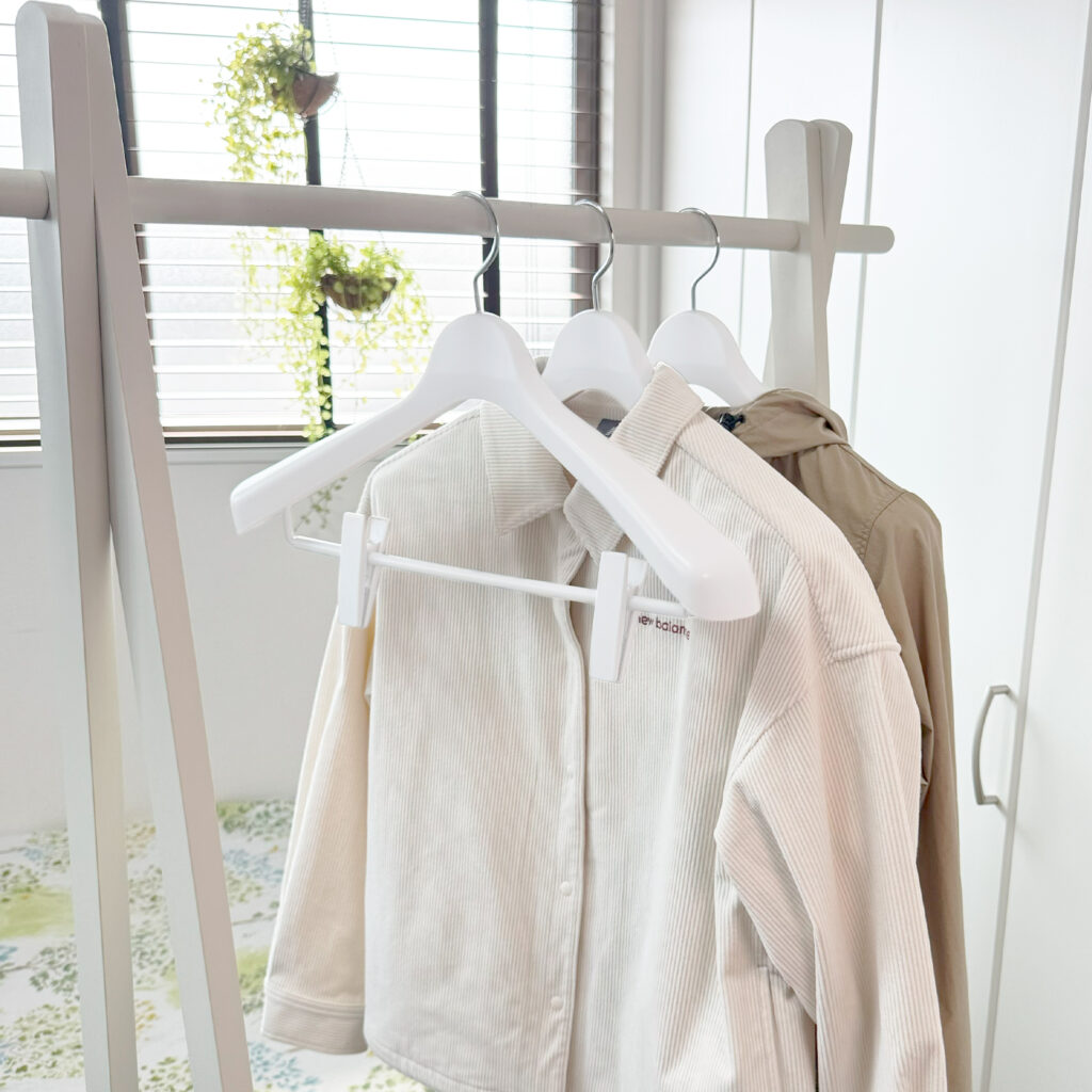 ホワイト&ライトグレーカラーで衣類が引き立つ、ジャケット用ハンガー。