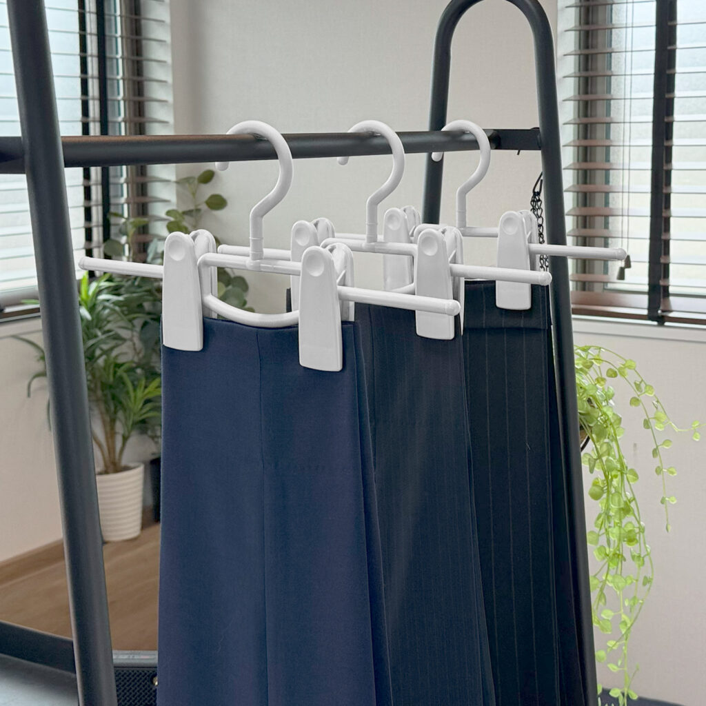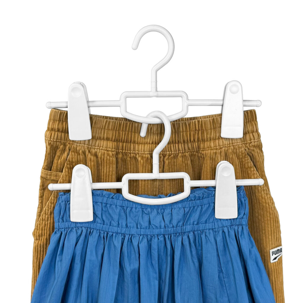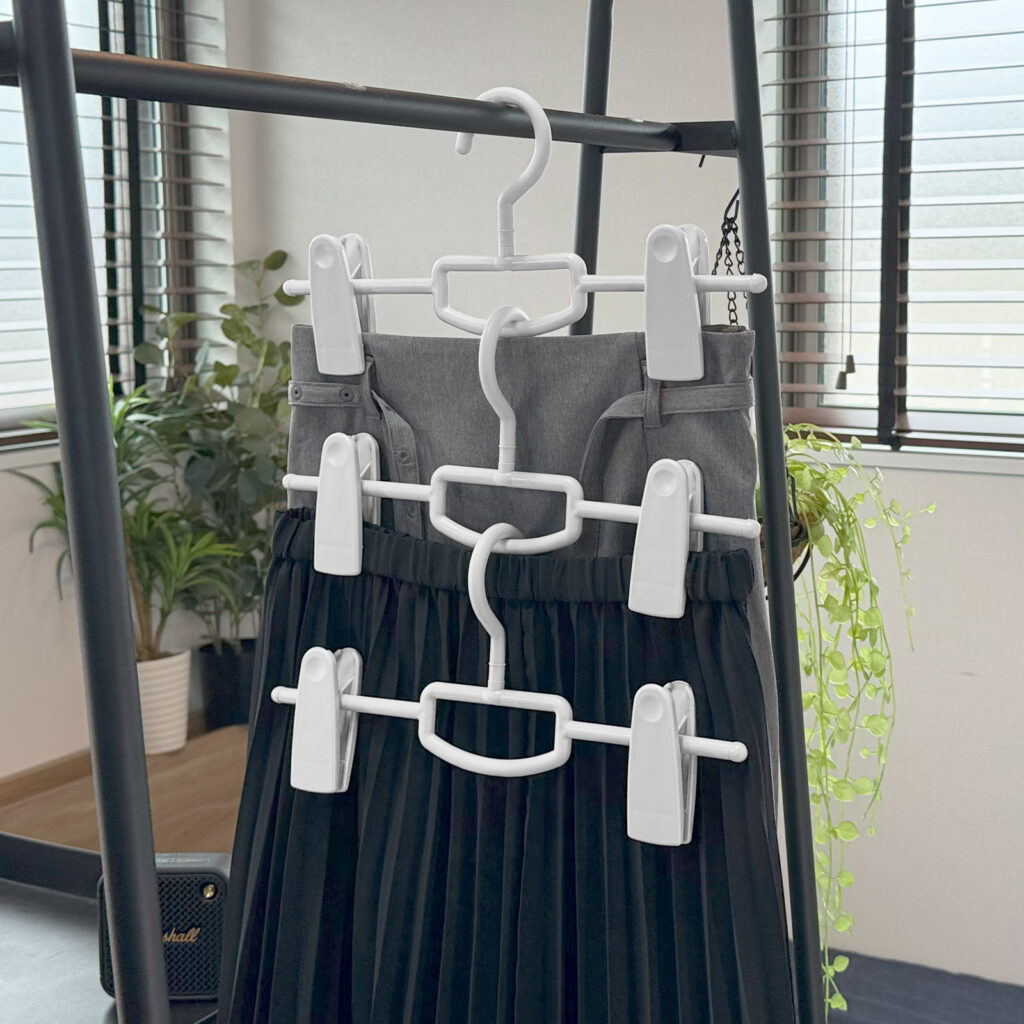 ホワイトカラーで衣類が引き立つ、スカート用ハンガー。