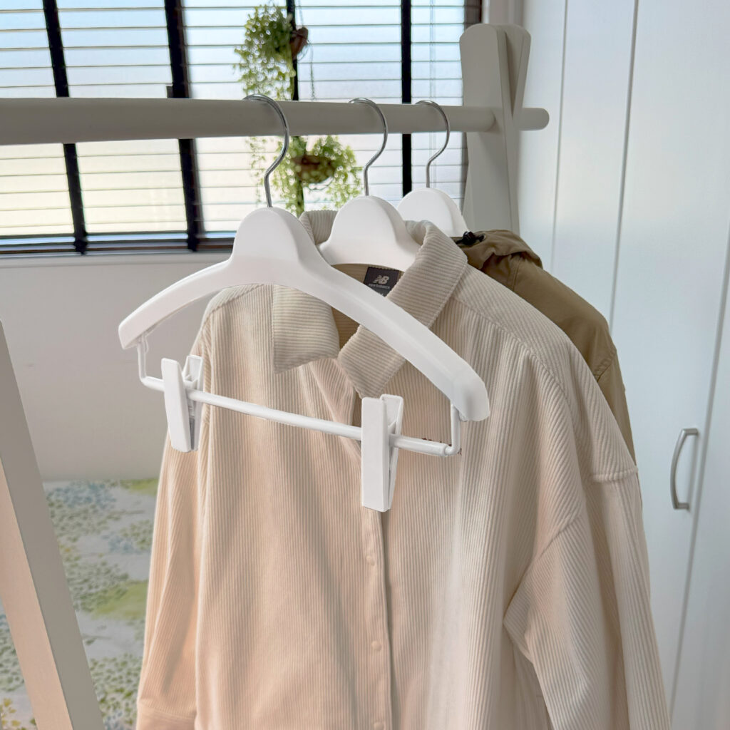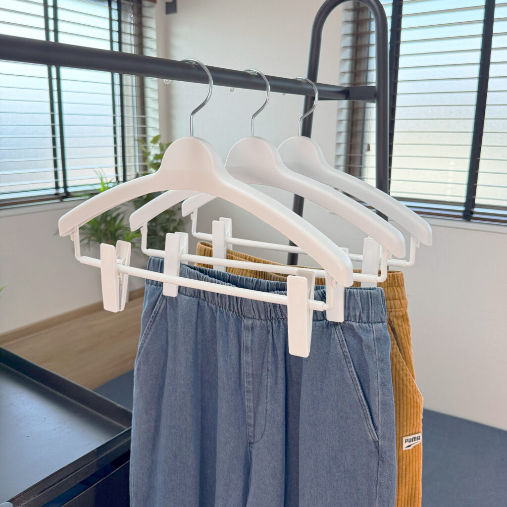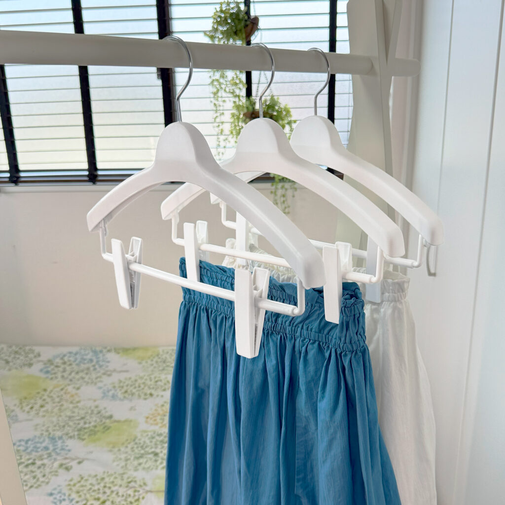 滑り止め付きのロングクリップで、スカートなどをしっかりと挟んで吊り下げられます。